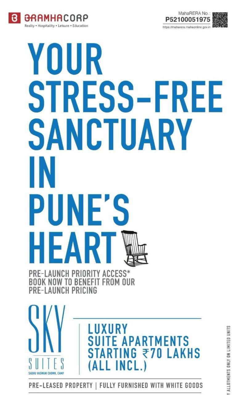 Discover Sky Suites, a premium high-rise residential landmark by BramhaCorp, crafted for those who seek comfort, convenience, and assured returns. Rising elegantly in Sadhu Vaswani Chowk, Camp, Sky Suites offers a unique blend of luxury living and smart investment.